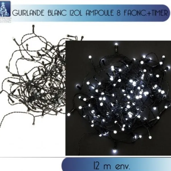 La Guirlande Lumineuse 120 Led Blanc Froid Avec Timer Avec Timer Est Proposée A L’Unité Avec Son Clignoteur 8 Jeux De Lumière Sur Une Longueur De 12 Mètres
