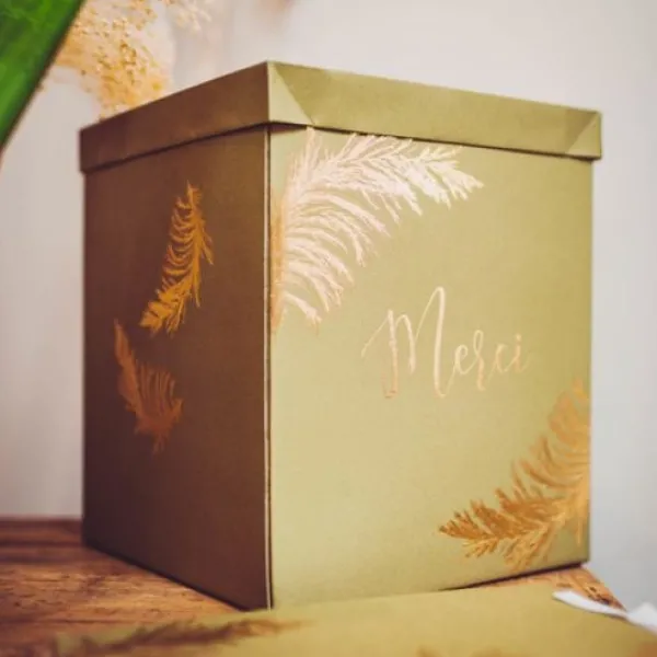 Somptueuse L’Urne Mariage Theme Pampa Avec Sa Couleur Kaki Et Dorure Or, Une Urne A Enveloppe Originale Et Tendance Qui Vous Plaira Certainement