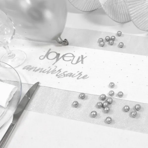 Le Sur Chemin De Table Joyeux Anniversaire Argent Est Vendu A L’Unité A Prix Discount, Avec Une Longueur De 4 Mètres