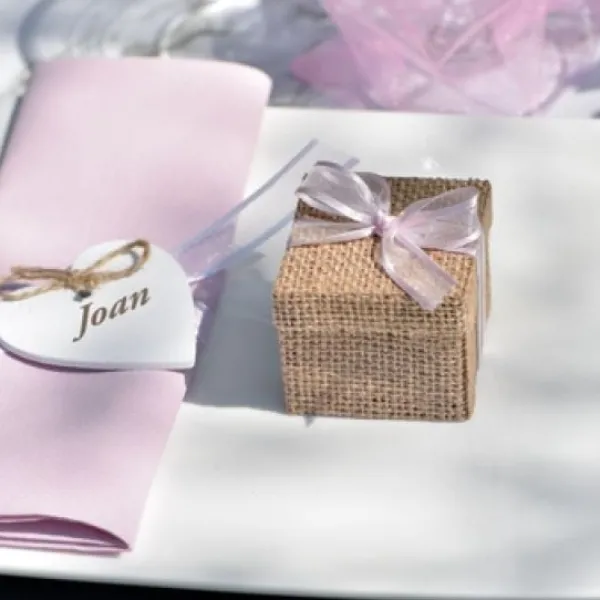 Chic Et Élègante La Boite Dragees Carrée En Jute Naturelle , Elle Sera Parfaite Pour Votre Décoration Mariage A Placer Sur Les Assiettes De Vos Convives Par Exemple En Guise De Cadeaux Aux Invités Idéal Lors D’Un THeme Mariage Naturel Ou Vintage